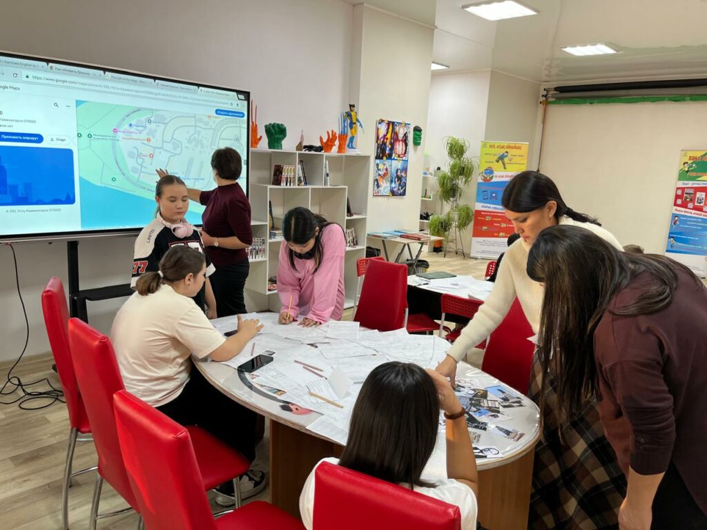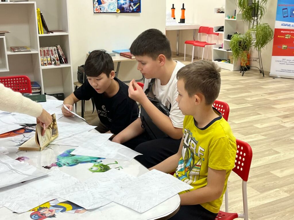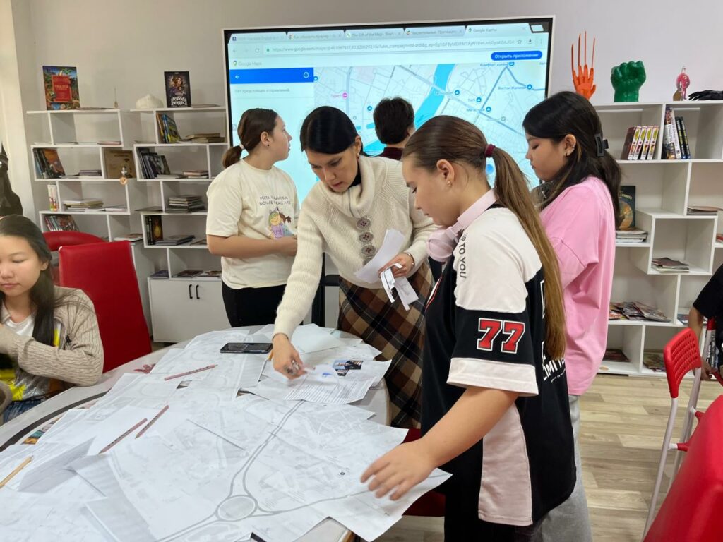 Балалар бөлімі мамандары оқушыларға Өскемен қаласының көшелерінің физикалық картасын ұсынып, сенсорлы панель арқылы қаланың виртуалды картасын ашты.