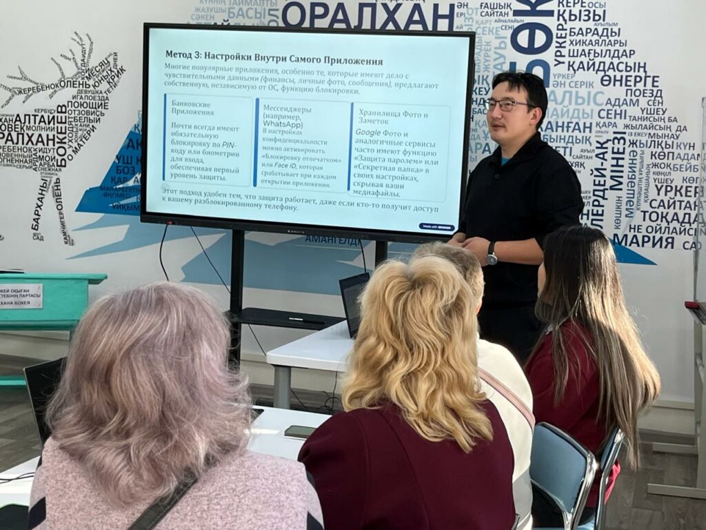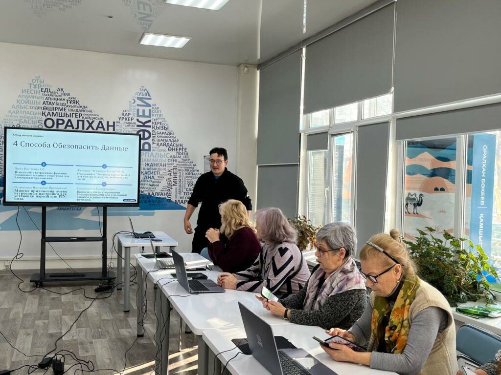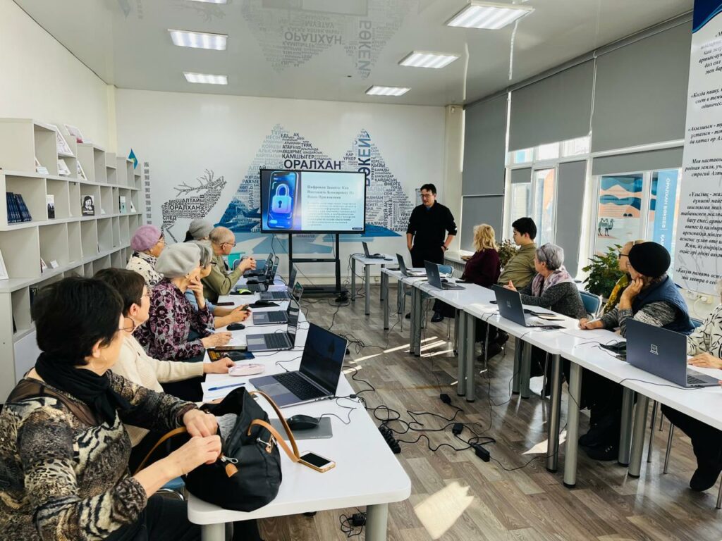 6 қараша күні Оралхан Бөкей атындағы кітапханада үлкен жастағы оқырмандарға арналған мобильді сауаттылық сабағы өтті. Қатысушылар экранды блоктау, қосымшаларды қорғау, алаяқтық хабарламаларды тану және жеке деректерді қауіпсіз сақтау жолдарын үйренді.