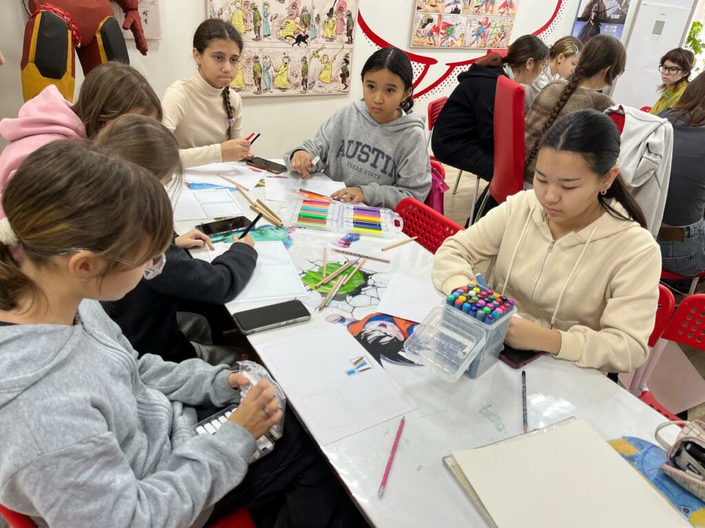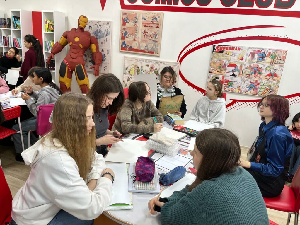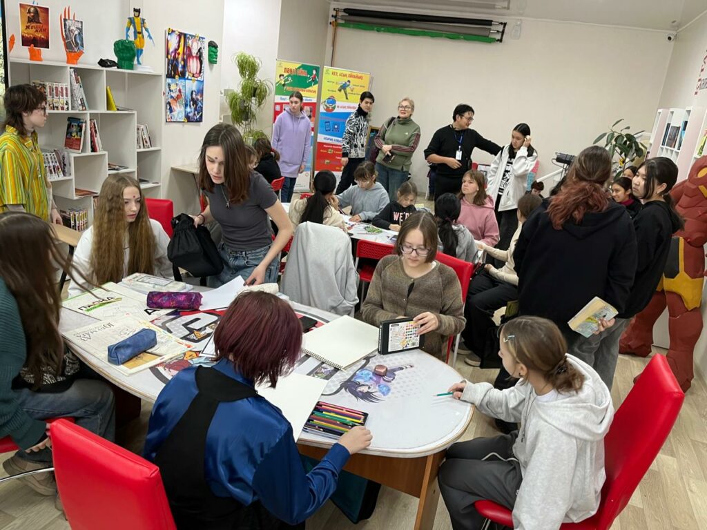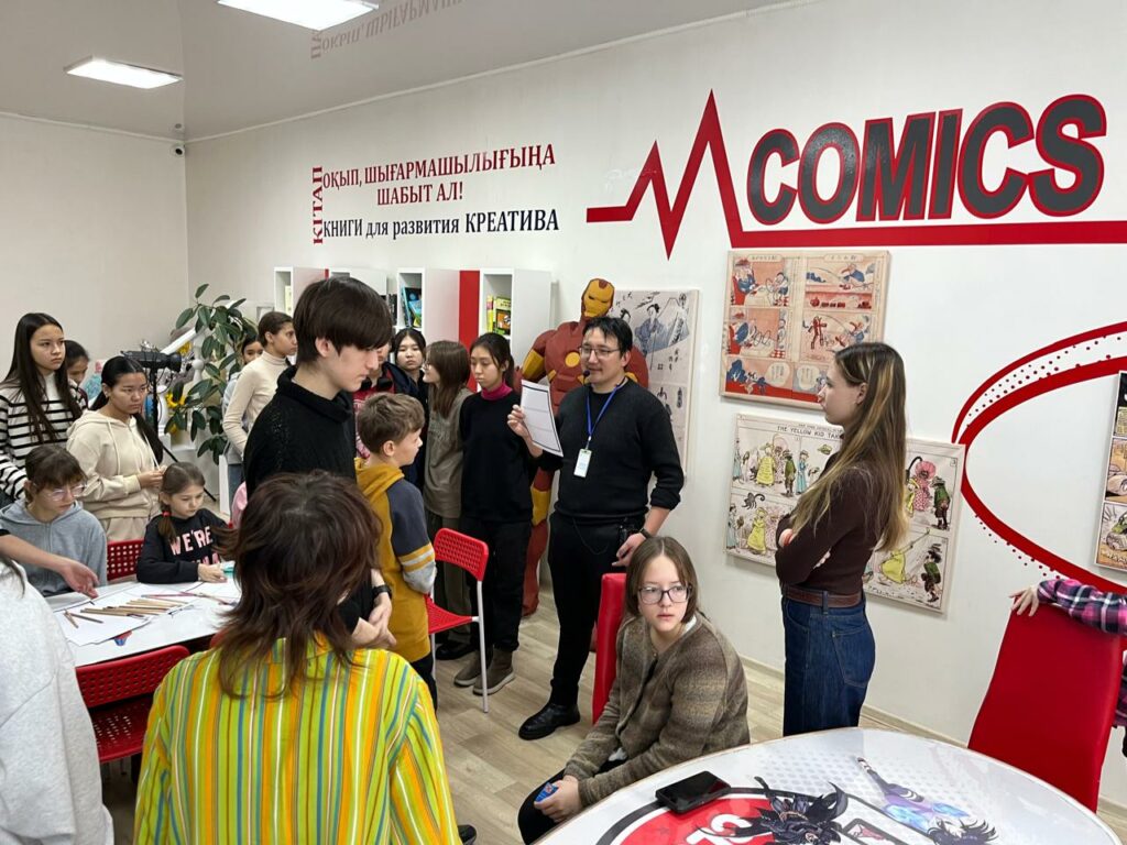 Кездесудің ең жарқын сәті практикалық бөлім болды. Балалар «Мен кітапханаға келдім» тақырыбында мини-комикстер жасады. Жұмыстар өте әртүрлі шықты: ерекше стильдер, қызықты кейіпкерлер, түпнұсқа сюжеттер. Бірақ бәрін бір нәрсе біріктірді — шығармашылық қуанышы, ойлау, эксперимент жасау және ынтымақтастықты жалғастыруға деген ниет.