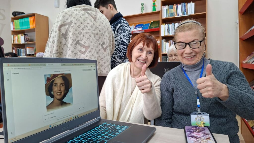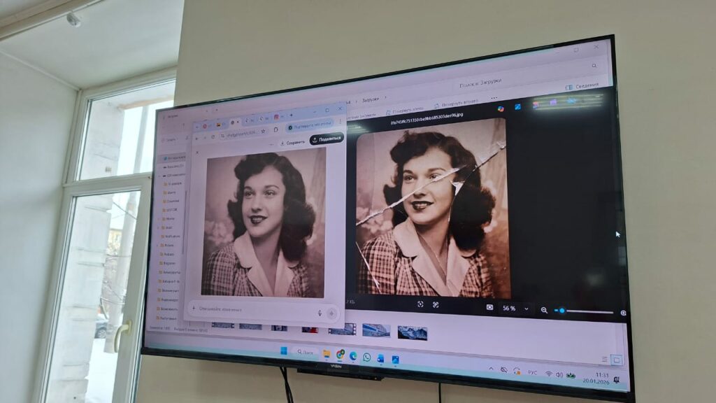 Сонымен қатар қатысушылар жасанды интеллект көмегімен ескі фотосуреттерді қалпына келтірумен айналысты. Практикалық жұмыс барысында ИИ технологияларының көмегімен фотосуреттердің сапасын жақсарту, жоғалған бөлшектерді қалпына келтіру және отбасы мен тарихи мұраны сақтаудың жаңа мүмкіндіктері көрсетілді.